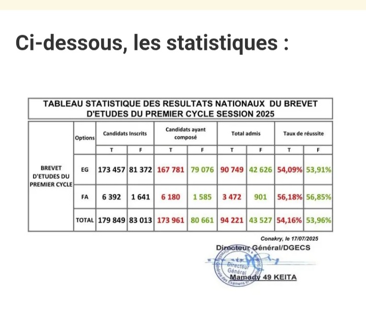 Le Ministère de l’Enseignement Pré-Universitaire et de l’Alphabétisation (MEPUA) a dévoilé ce jeudi le tableau statistique national des résultats du Brevet d’Études du Premier Cycle (BEPC), session 2025, quelques jours après la proclamation de ceux du Certificat de fin d’Études Élémentaires (CEE).