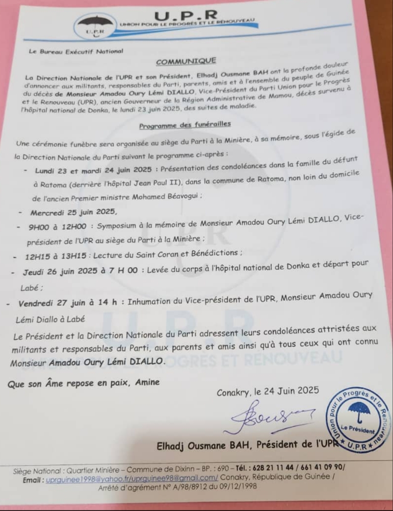 C’est avec une immense tristesse que le Bureau Exécutif National de l’Union pour le Progrès et le Renouveau (UPR), par la voix de son Président Elhadj Ousmane BAH, annonce le décès de Monsieur Amadou Oury Lémi DIALLO, Vice-président du Parti et ancien Gouverneur de la Région Administrative de Mamou.