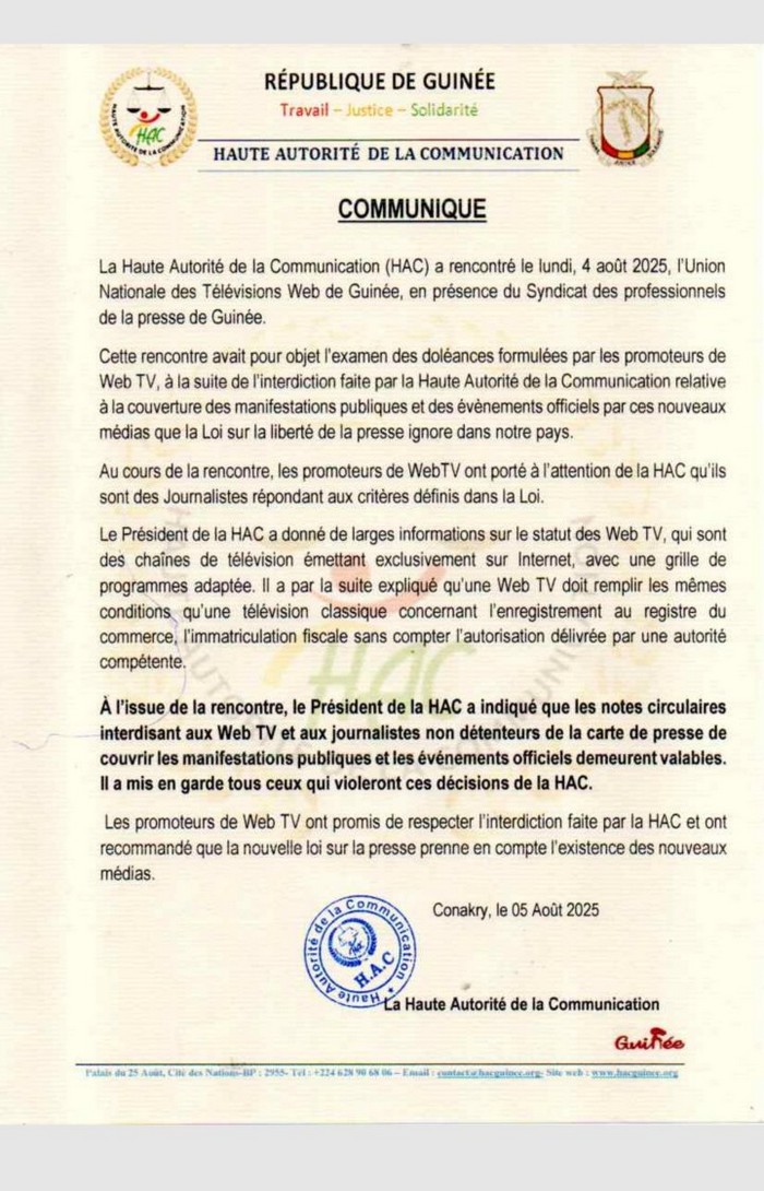 La Haute Autorité de la Communication (HAC) a rencontré, ce lundi 4 août 2025, l’Union Nationale des Télévisions Web de Guinée (UNTWG), en présence du Syndicat des professionnels de la presse de Guinée. L’objectif : examiner les doléances des promoteurs de Web TV, suite à l’interdiction qui leur a été faite de couvrir les manifestations publiques et les événements officiels.