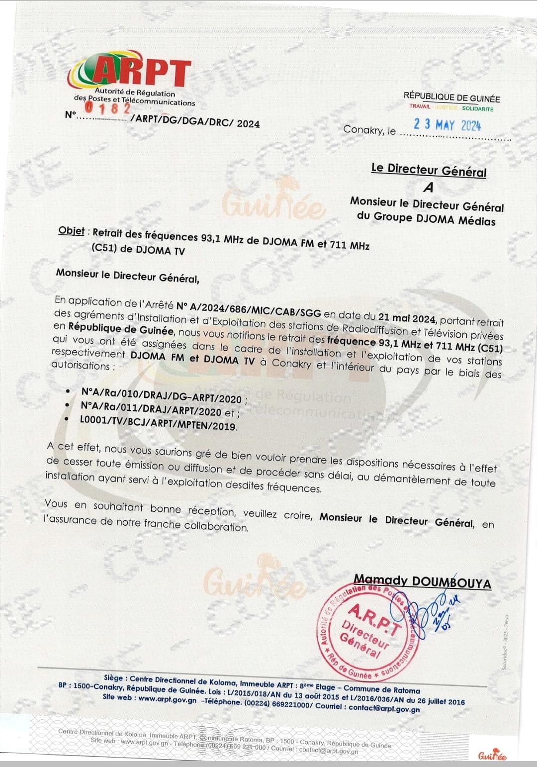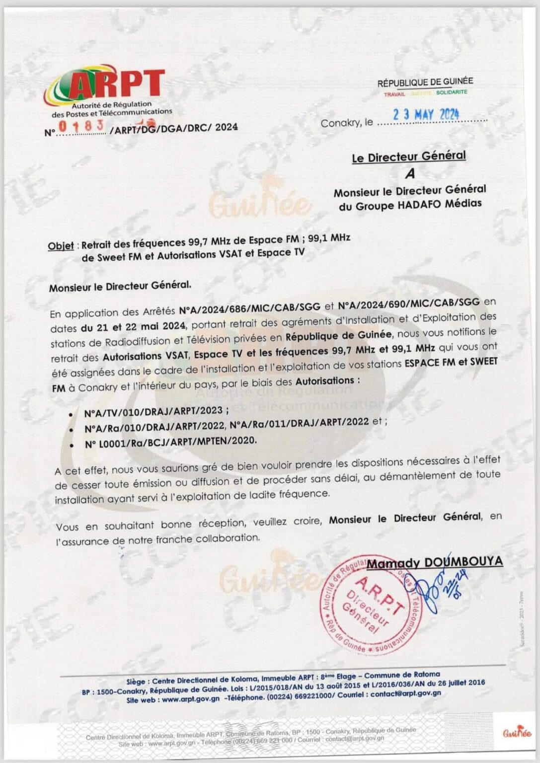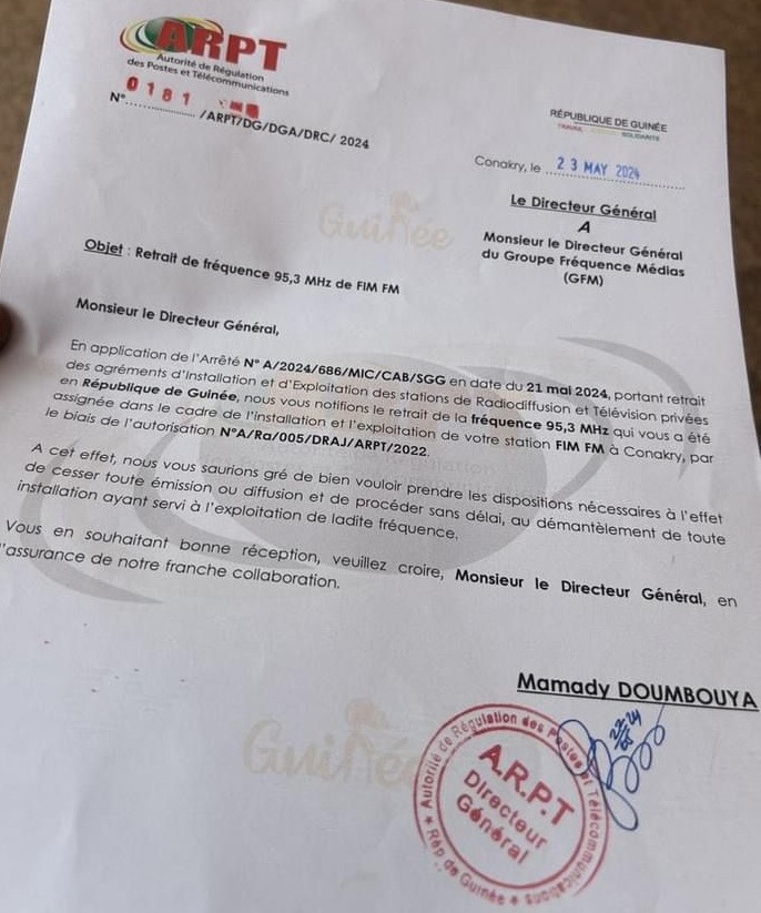 Dans un communiqué, publié ce jeudi, 23 mai 2024, l’Autorité de Régulation des Postes et Télécommunications (ARPT) a procédé au retrait des autorisations VSAT, d’Espace TV et les fréquences 99,7 MHz et 99,1 MHz assignées dans le cadre de l’installation et l’exploitation des stations Espace FM et Sweet FM à Conakry et à l’intérieur du pays.