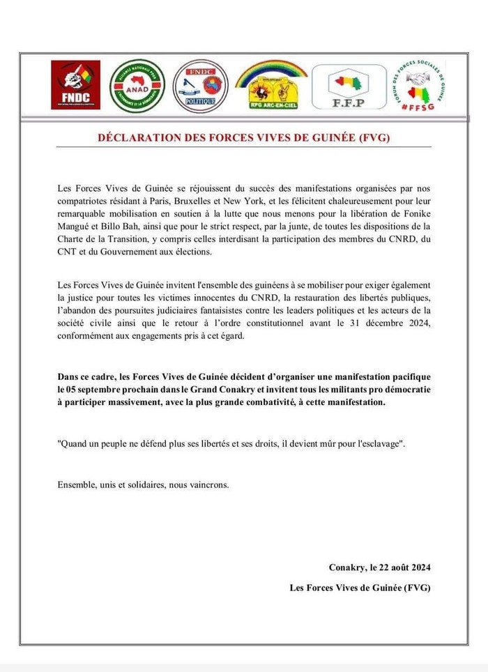 Des acteurs sociopolitiques guinéens regroupés au sein des forces vives dans une déclaration appellent les guinéens à se mobiliser pour exiger le retour à l’ordre constitutionnel.