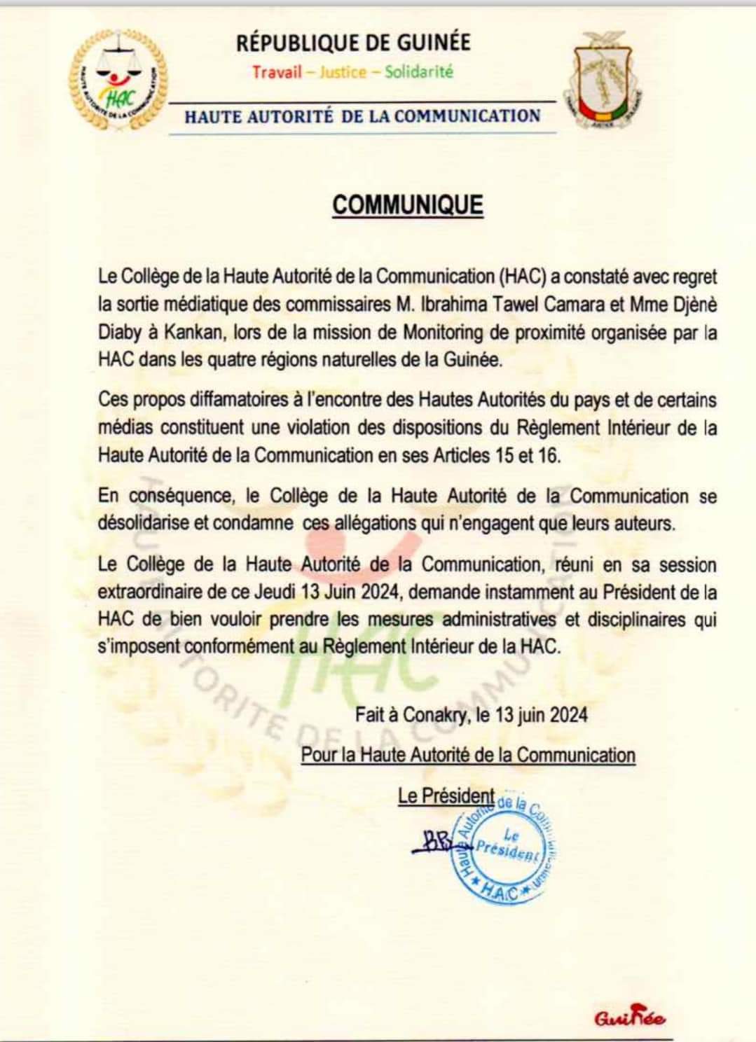 Une allégation que la haute autorité de la communication a démenti avant de suspendre ces deux commissaires dans un communiqué mis à la disposition de la presse ce jeudi 13 juin 2024.