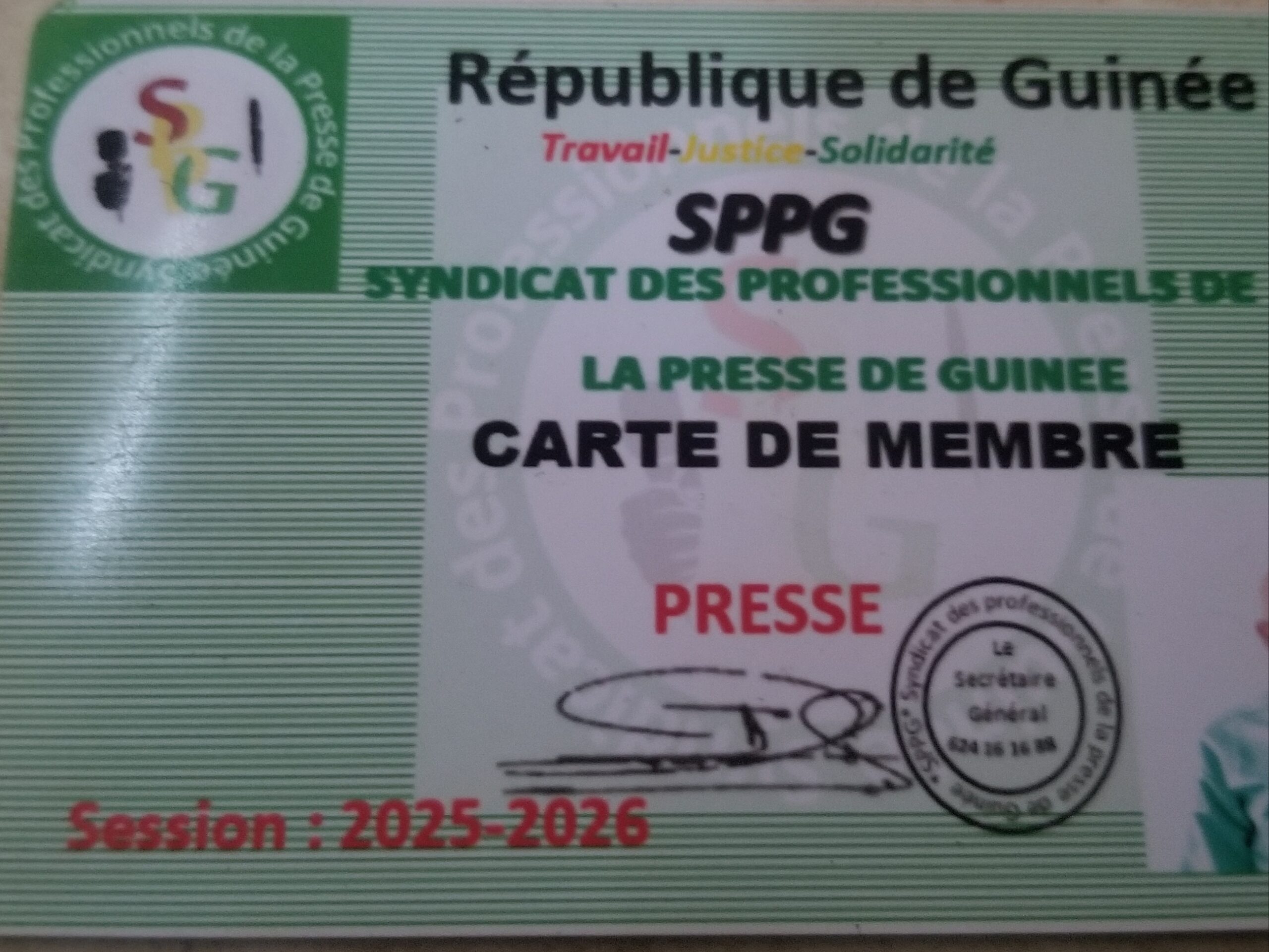 Conakry, mars 2025 – Le Syndicat des Professionnels de la Presse de Guinée (SPPG) a récemment lancé l’édition 2025-2026 de sa carte de membre, désormais en format plastique et valable pour deux ans. Cette initiative vise à répondre aux préoccupations des journalistes de terrain, notamment ceux confrontés aux intempéries.