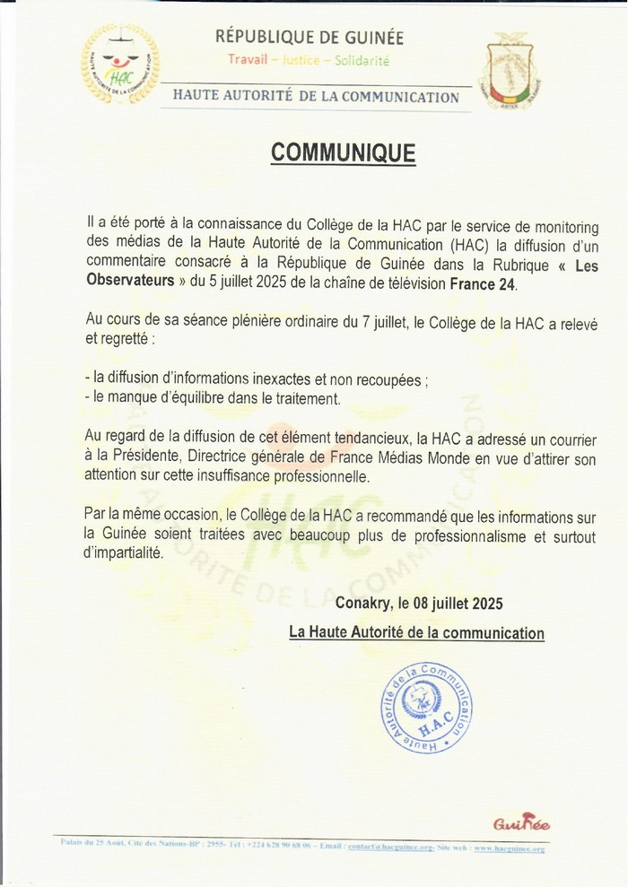 Dans un communiqué officiel rendu public ce mardi 08 juillet 2025, la Haute Autorité de la Communication (HAC) de Guinée a interpellé la Présidente de France Médias Monde à propos d’un reportage diffusé par France 24, dans la rubrique Les Observateurs, portant sur la situation guinéenne.