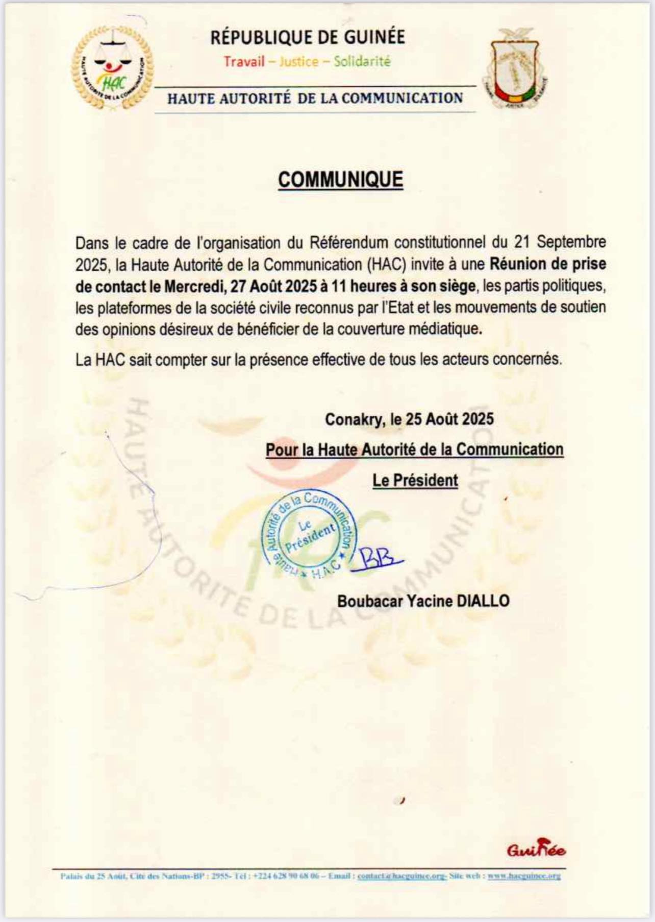 Alors que la Guinée se prépare à un référendum constitutionnel décisif, la Haute Autorité de la Communication (HAC) a publié ce lundi un communiqué officiel appelant à une réunion de concertation avec les partis politiques, les organisations de la société civile ainsi que les mouvements désireux de bénéficier de la couverture médiatique nationale durant cette période cruciale.